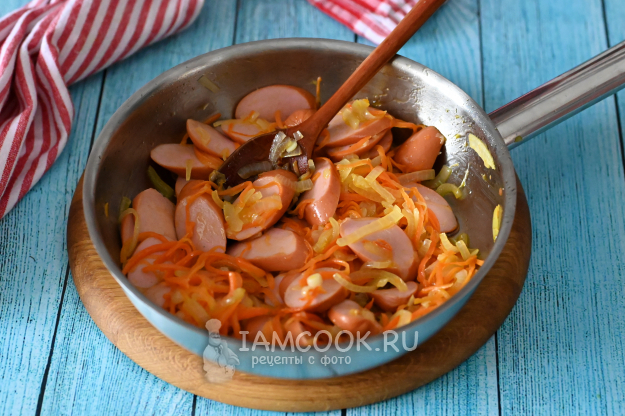 Обжарьте сосиски вместе с луком и морковью примерно 1 минуту.