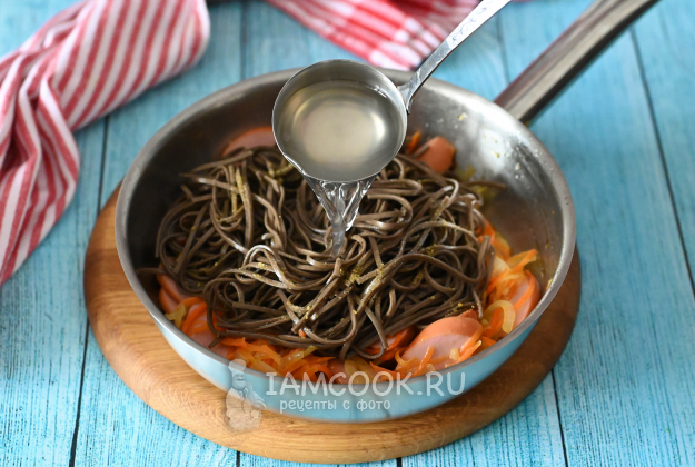 Влейте в сковороду неполный половник воды от варки лапши и всё перемешайте.