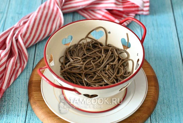 Параллельно в кипящей воде отварите гречневую лапшу по инструкции на упаковке. Обычно такая лапша варится быстро, буквально 2-3 минуты. Лапшу я варила без добавления соли, ниже расскажу почему.
