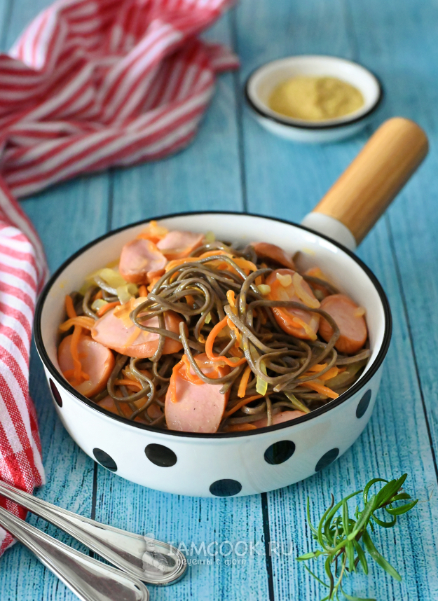 Подавайте гречневую лапшу с сосисками сразу же к столу. По желанию можно сопроводить блюдо кетчупом или другим соусом.