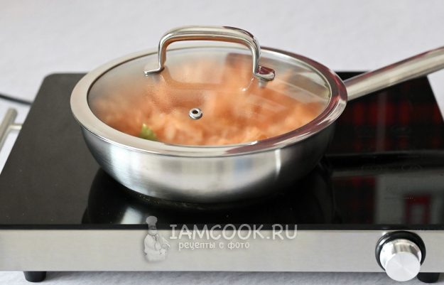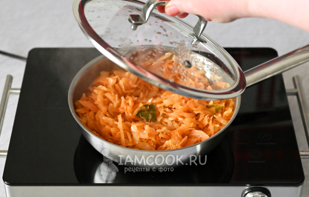 Всё перемешайте. Огонь убавьте до среднего или чуть ниже. Сковороду накройте крышкой и тушите капусту примерно 30-35 минут.