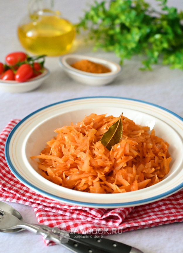 Прошло полчаса, и тушёная капуста с томатной пастой готова.