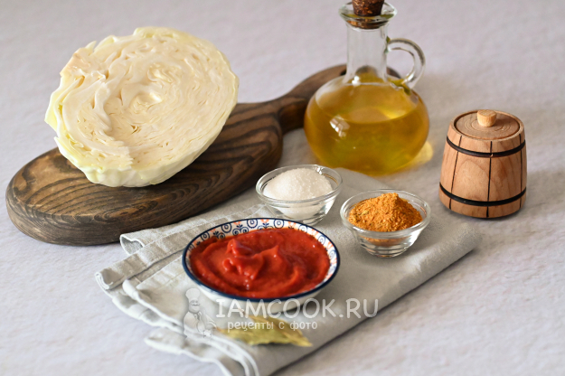 Соберите необходимые продукты для приготовления тушёной капусты с томатной пастой.