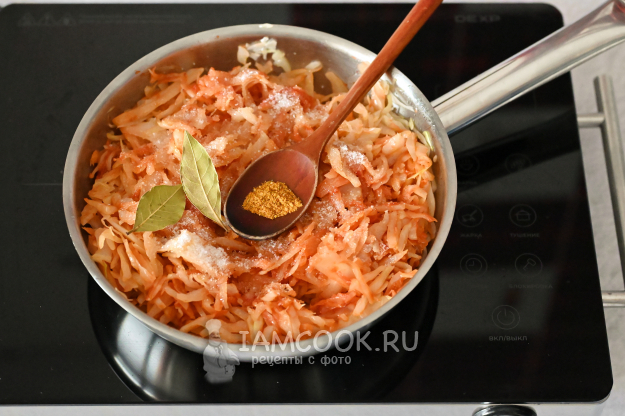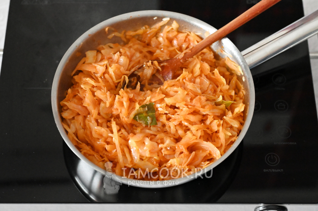 В процессе тушения капуста выделит сок, но если вам покажется маловато жидкости, влейте в сковороду немного воды (100-150 мл).