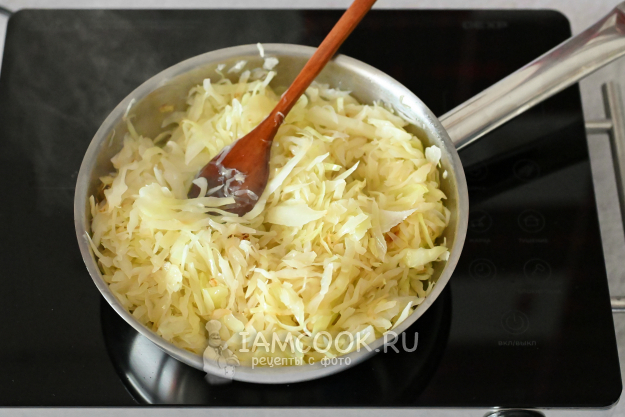 В сковороде разогрейте подсолнечное масло и отправьте туда нашинкованную капусту. На самом сильном огне капусту поджарьте до румяных бочков (3-5 минут). Нужно, чтобы капуста осела и начала подрумяниваться. Периодически помешивайте, крышкой пока не накрывайте.