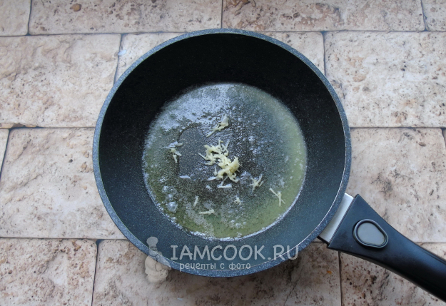 Растопите масло и добавьте тертый зубчик чеснока.