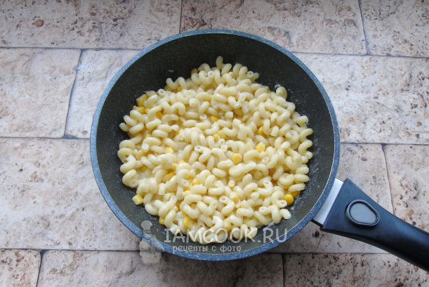 А затем выложите их в сковороду с приготовленным соусом из кукурузы, сливочного масла, сыра, чеснока и молока. Перемешайте макароны с соусом.