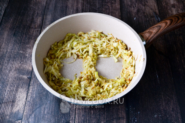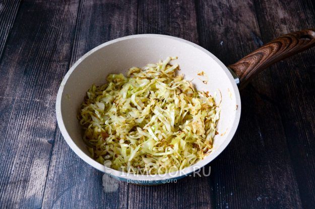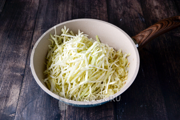 Лук сдвиньте к краю сковороды и положите нарезанную тонкой соломкой капусту. Жарьте капусту, помешивая. Посолите во время жарки.