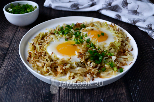 Жареная капуста с луком и яйцами готова. Подавайте блюдо сразу со сковороды, горячим. По желанию посыпьте свежей зеленью.
