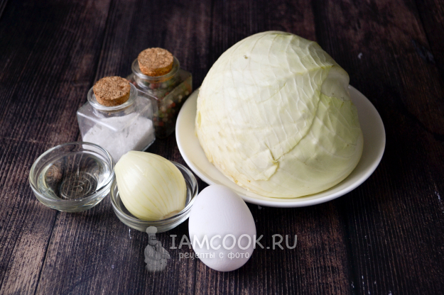 Соберите продукты для приготовления жареной капусты с луком и яйцом. Капусту очистите от верхних жестких листьев. Репчатый лук очистите.