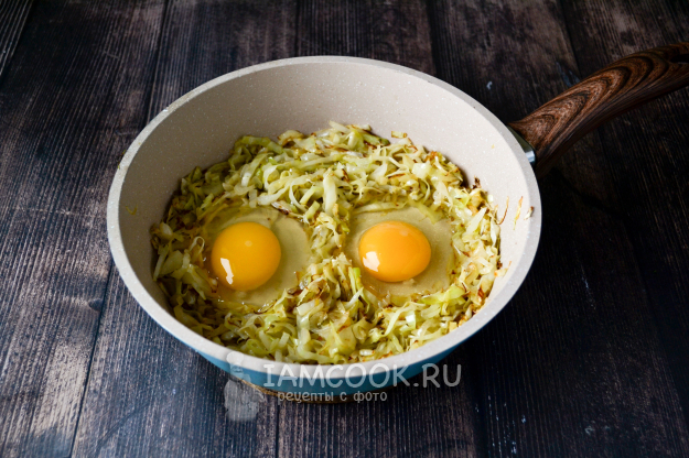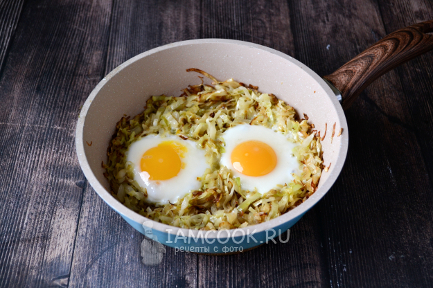 Не жарьте капусту до полной готовности - она будет продолжать готовиться во время жарки яиц. Ложкой сделайте гнезда для яичницы-глазуньи.