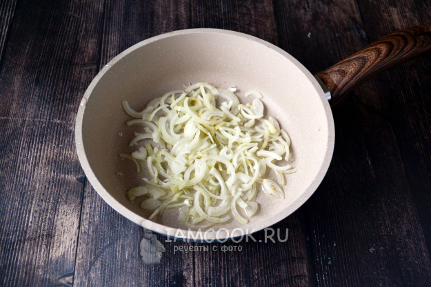 Лук нарежьте тонкими полукольцами, положите на разогретую с растительным маслом сковороду.