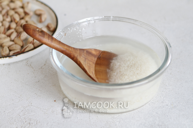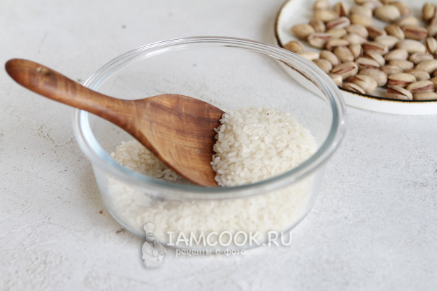 Продукты для приготовления риса с фисташками соберите по списку. Фисташки лучше выбрать в меру солёные.