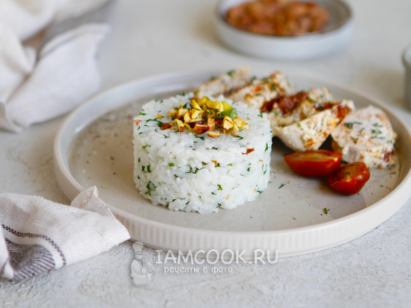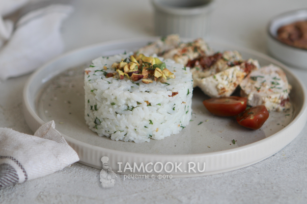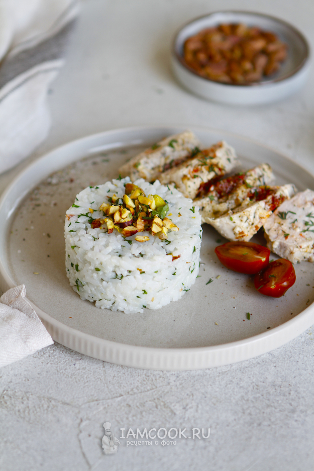 Такой рис может быть отличным гарниром к курице и рыбе. Я подавала рис с фисташками вместе с куриной грудкой гармошкой.