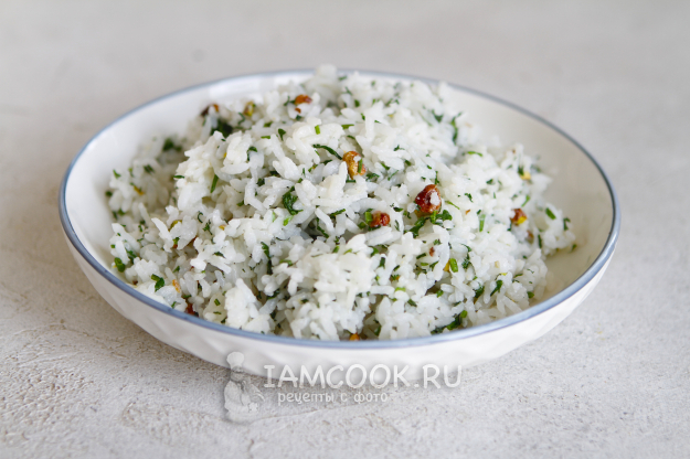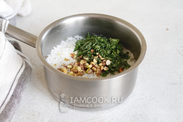 Добавьте фисташки с зеленью к рису. Перемешайте.