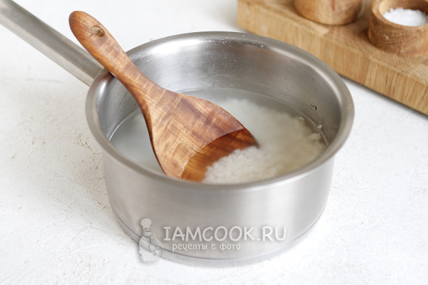 Влейте теплую воду. Я добавляла воды из расчета 1:2 (на 100 г риса - 200 мл воды). Доведите воду до кипения. Как только вода закипит, убавьте огонь, слегка посолите. Варим рис на небольшом огне, сильного кипения не должно быть. Как только выкипит вся вода, сотейник закройте крышкой. Сделайте минимальный огонь и готовьте рис еще примерно 5 минут.