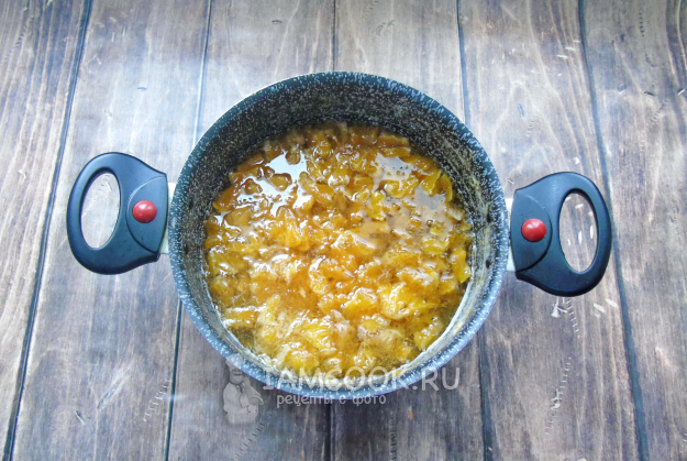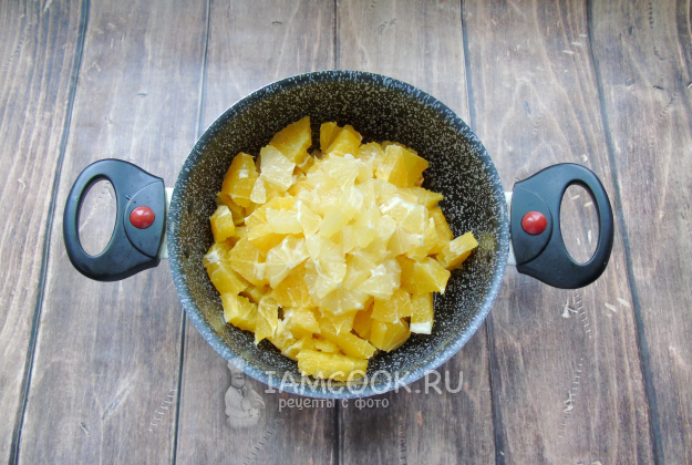 Выложите нарезанные цитрусовые в кастрюлю с антипригарным покрытием.