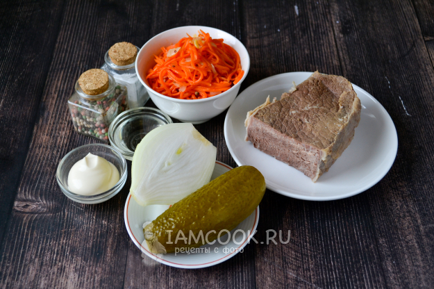 Соберите продукты для приготовления салата "Обжорка" с говядиной и корейской морковью. Кусок говядины отварите в подсоленной воде до готовности. Время варки будет зависеть от возраста животного, размера куска. Готовое мясо выньте из бульона и полностью охладите.