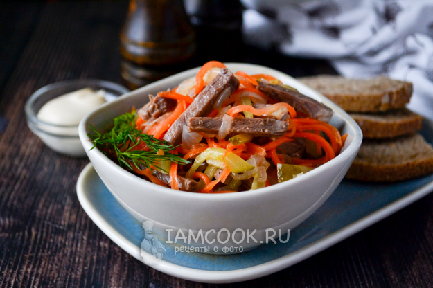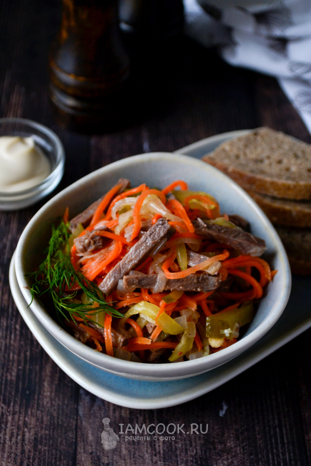 Салат «Обжорка» с говядиной и корейской морковью готов к подаче на стол.