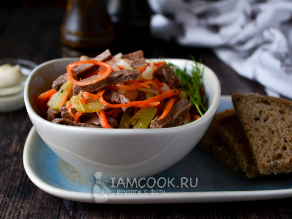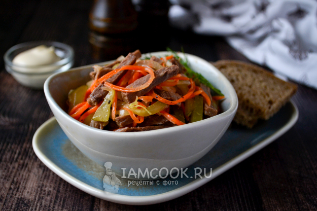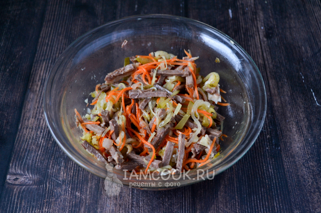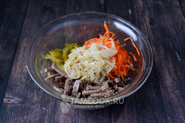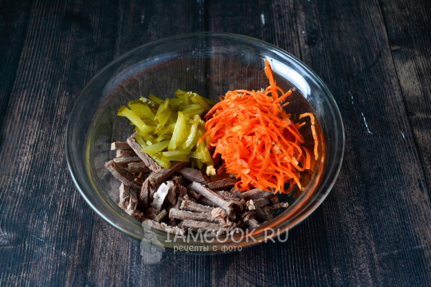 В салатник положите нарезанную говядину, огурец и морковь по-корейски.
