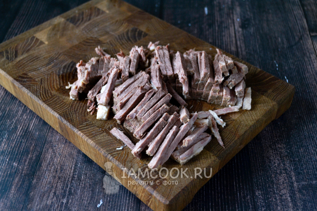 Говядину нарежьте поперек волокон тонкой соломкой.
