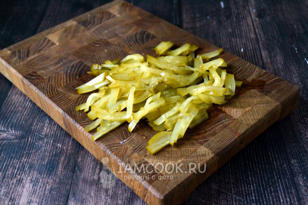 Маринованный огурец нарежьте соломкой.
