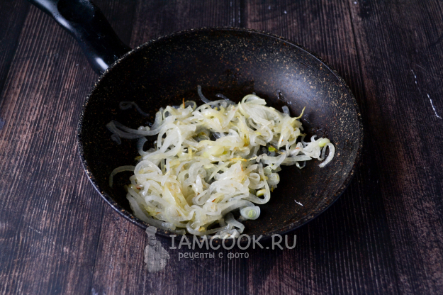 На растительном масле обжарьте лук, помешивая, до легкого золотистого цвета на среднем огне.