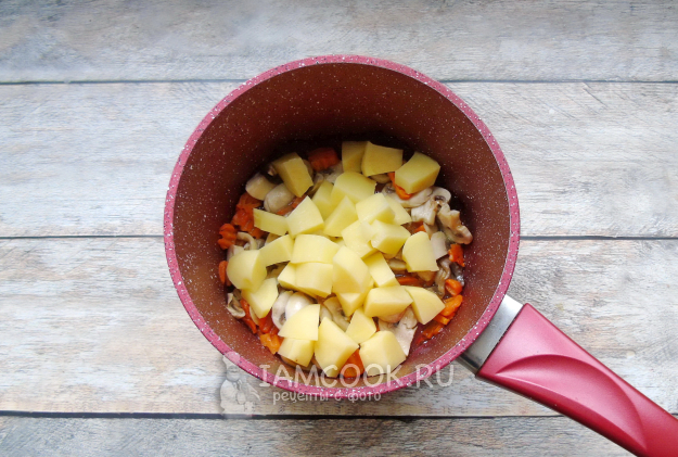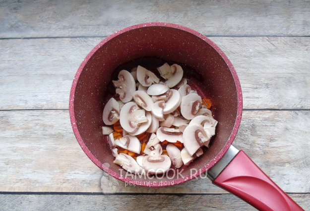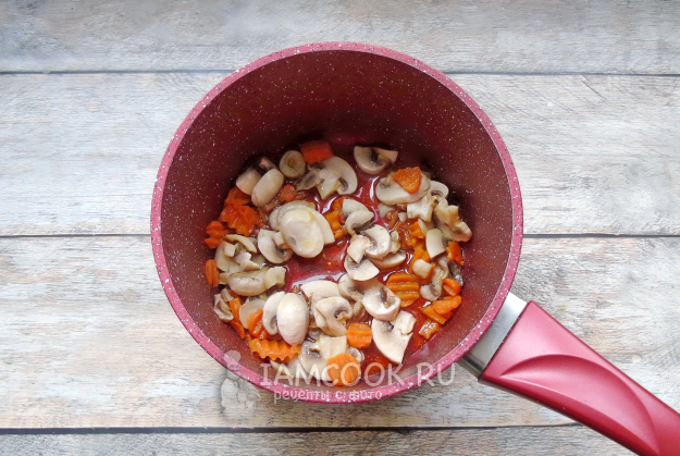 Шампиньоны очистите, помойте и нарежьте. Добавьте к моркови в кастрюлю.
