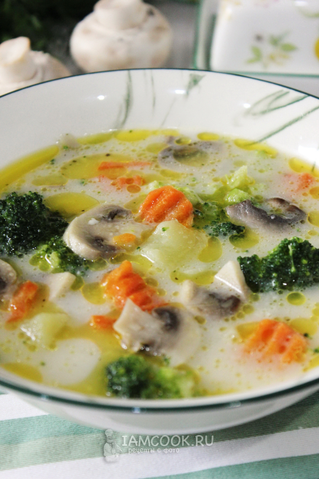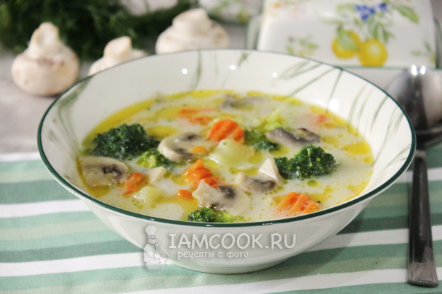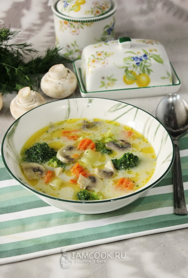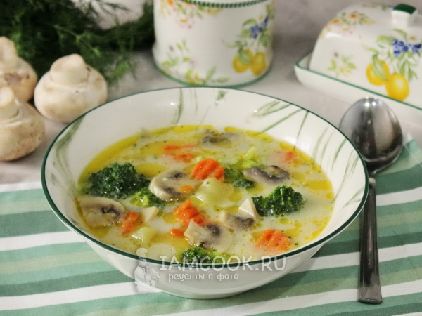 Сырный суп с брокколи и шампиньонами готов.
