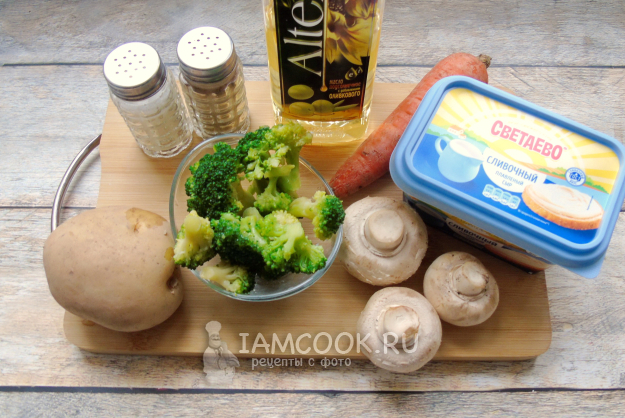 Соберите ингредиенты для приготовления сырного супа с брокколи и шампиньонами.