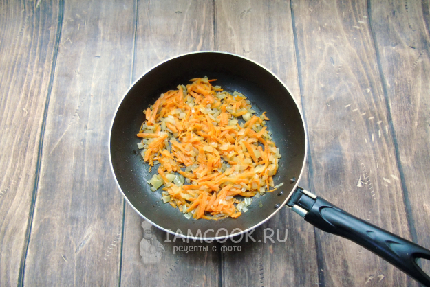 Морковь очистите, помойте и натрите на терке. Добавьте к луку и жарьте 3-4 минуты.