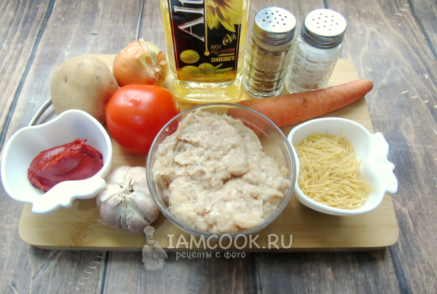 Соберите ингредиенты для приготовления супа из жареных овощей с мясным фаршем.