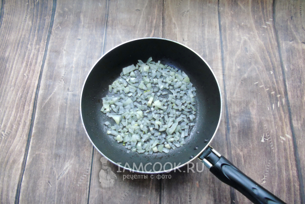 Репчатый лук очистите, помойте и мелко нарежьте. Обжарьте на сковороде с маслом до прозрачности.