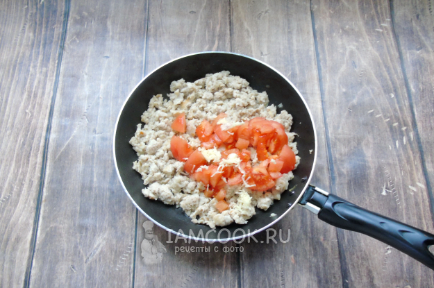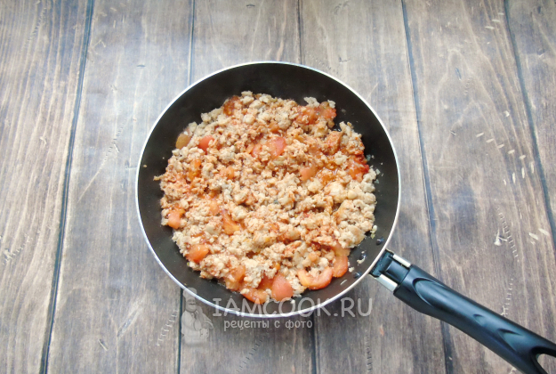 Жарьте фарш с помидором, чесноком и пастой еще 5-6 минут.