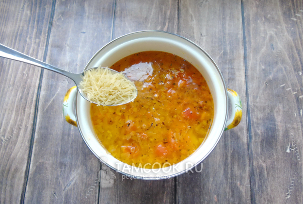 После выложите в кастрюлю с картошкой, луком и морковью. Добавьте тонкую, короткую вермишель.