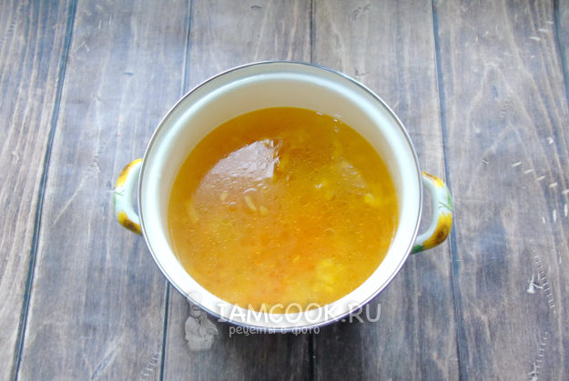 В кастрюлю налейте воду или бульон, выложите жареные картофель, лук и морковь. Начинайте варить суп.