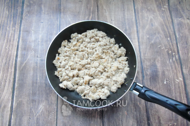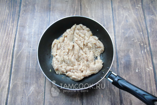 Тем временем фарш выложите на горячую сковороду с небольшим количеством растительного масла.