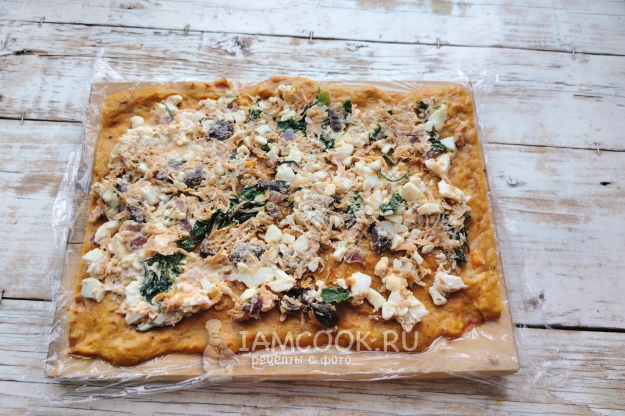 Когда он немного остынет, сверху равномерно нанести начинку.