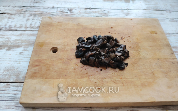 Пока выпекается корж, приготовить начинку. Грибы можно использовать свежие или замороженные, лесные или шампиньоны. Их нужно промыть и мелко нарезать ножом.