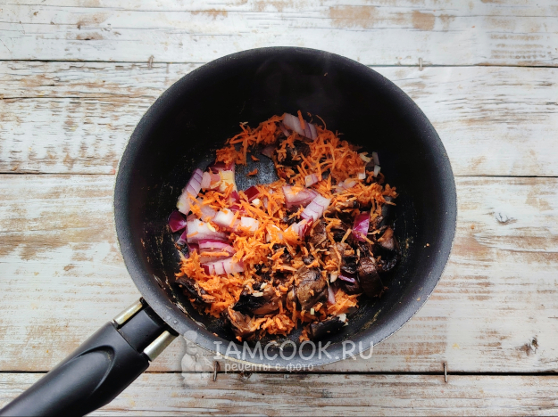 Морковь, лук и грибы обжарить на масле до мягкости.
