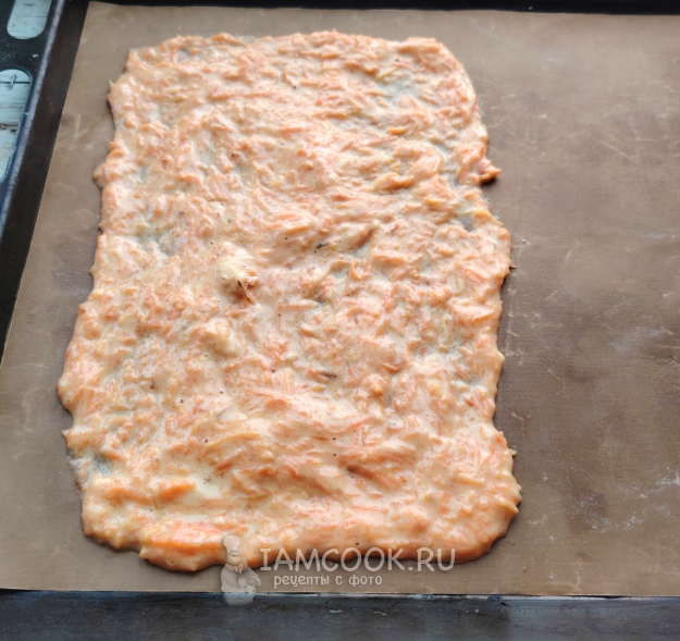 Выложить морковный корж на пищевую пленку и подровнять с краев ножом.