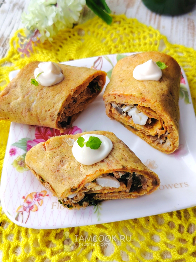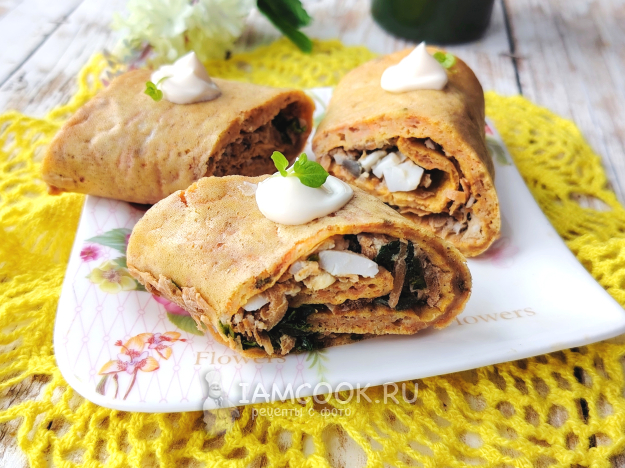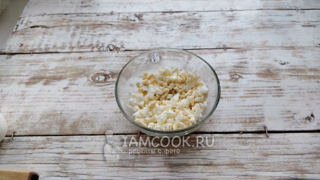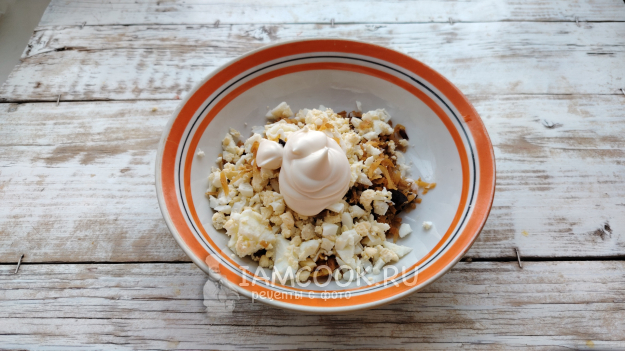 Соединить остывшую начинку, добавить специи, майонез, можно рубленую зелень петрушки для аромата, тщательно перемешать массу.