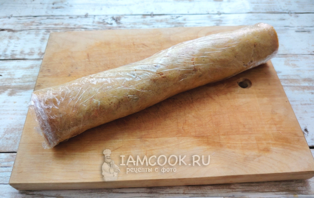 Свернуть корж с начинкой в рулет, завернуть края пищевой пленкой, убрать на 5 часов в холодильник.