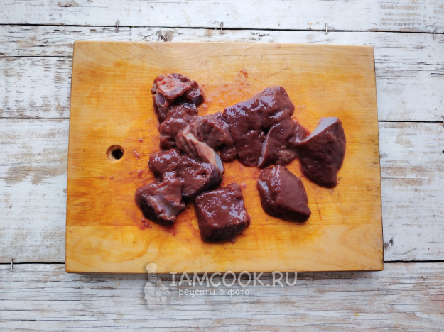 Печень лучше приобрести охлажденной, чтобы быть уверенным в свежести продукта. Субпродукт залить холодной водой и оставить на пару часов, чтобы удалить из продукта все ненужное. Нарезать промытую печень на кусочки.