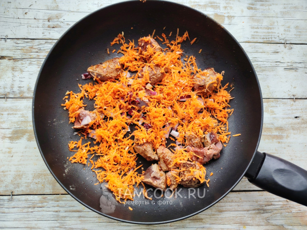 На сковороде разогреть масло. Выложить печенку. Обжарить пару минут, до посветления кусочков печени, затем к ней отправить морковь и лук, перемешать, жарить около 20 минут на медленном огне, периодически помешивая лопаткой.