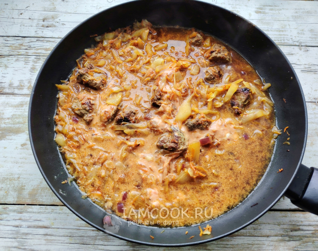 Выложить соус в сковороду, влить воду, перемешать, продолжить тушение на медленном огне под крышкой.