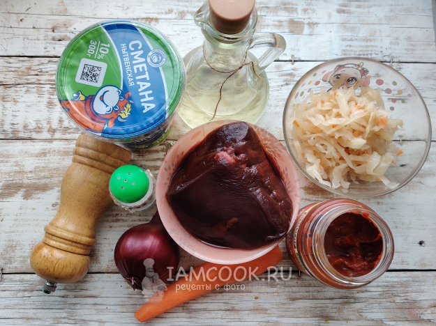 Собрать по списку продукты для приготовления говяжьей печени с квашеной капустой на сковороде.