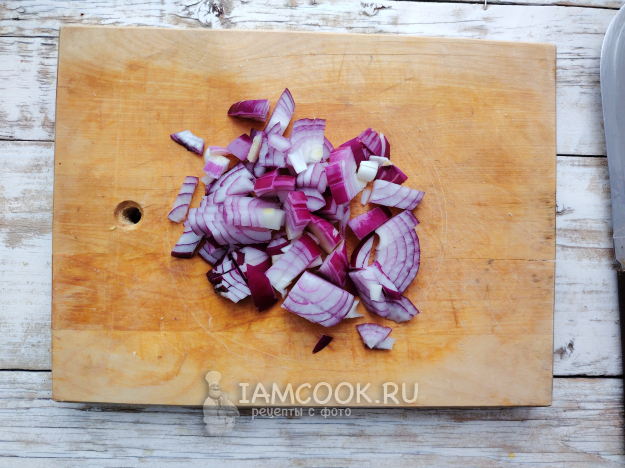 Луковицу освободить от шелухи, мелко порубить ножом.