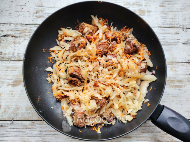 Затем в сковороду отправить квашеную капусту, перемешать, продолжить жарку еще около 10 минут.