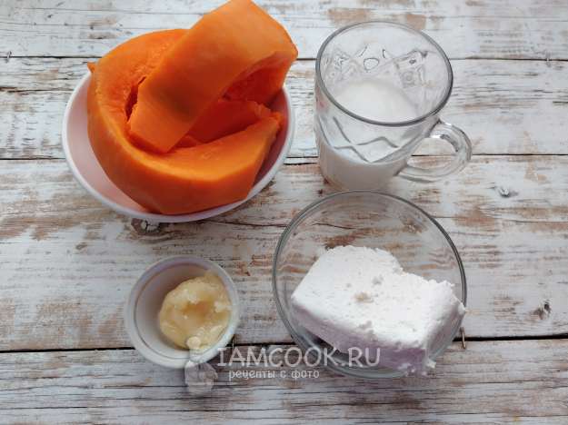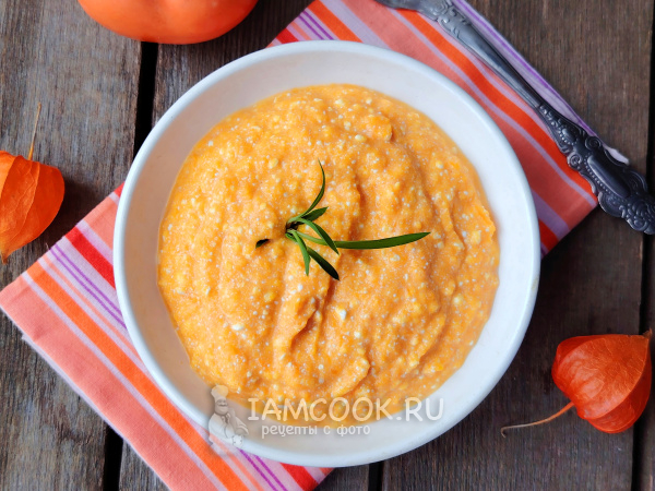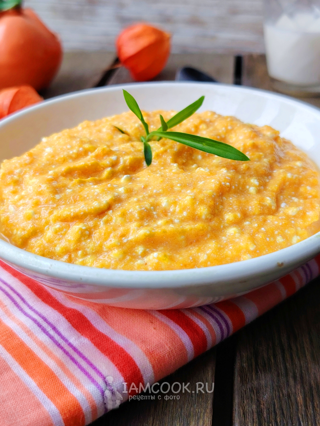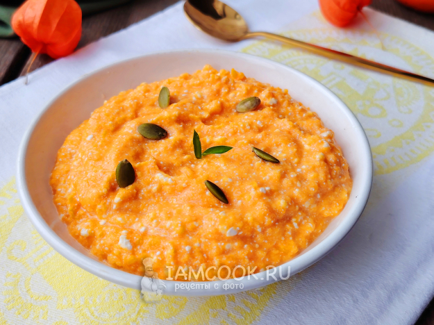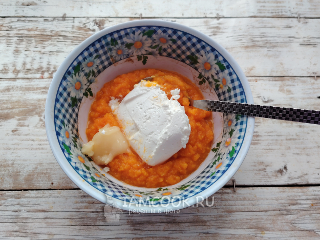 Соединить немного остывшее тыквенное пюре с творогом. Добавить мед, влить молоко.